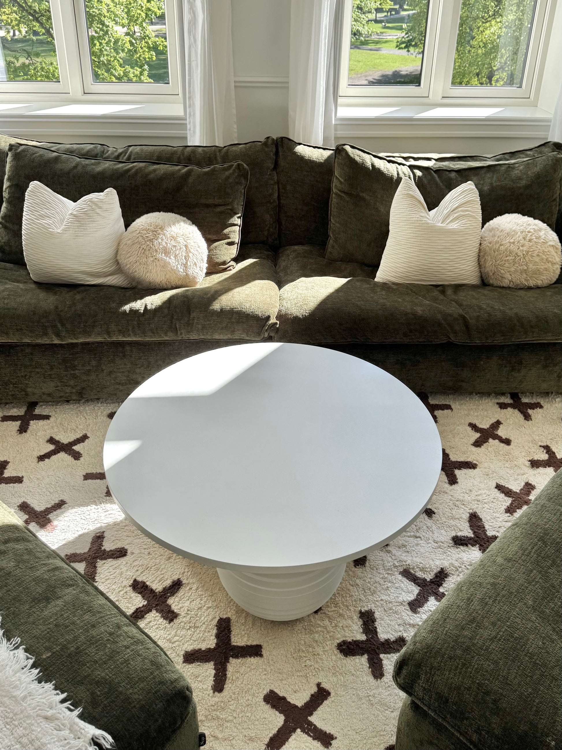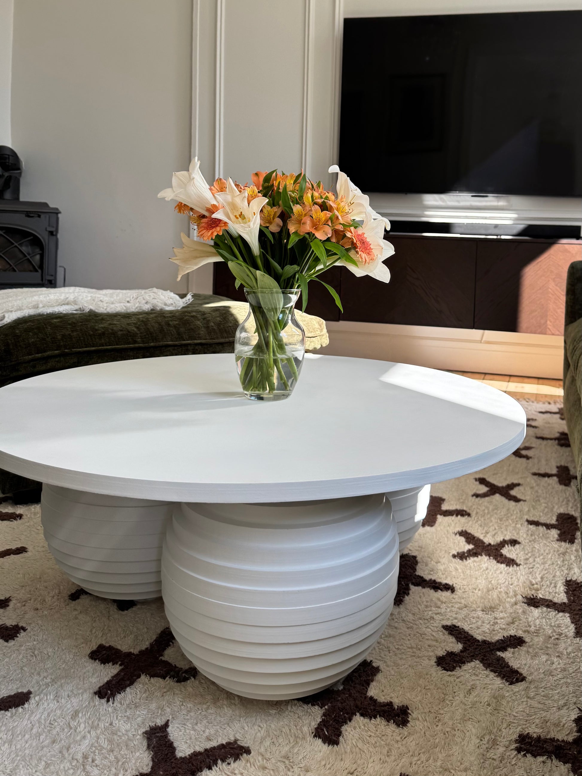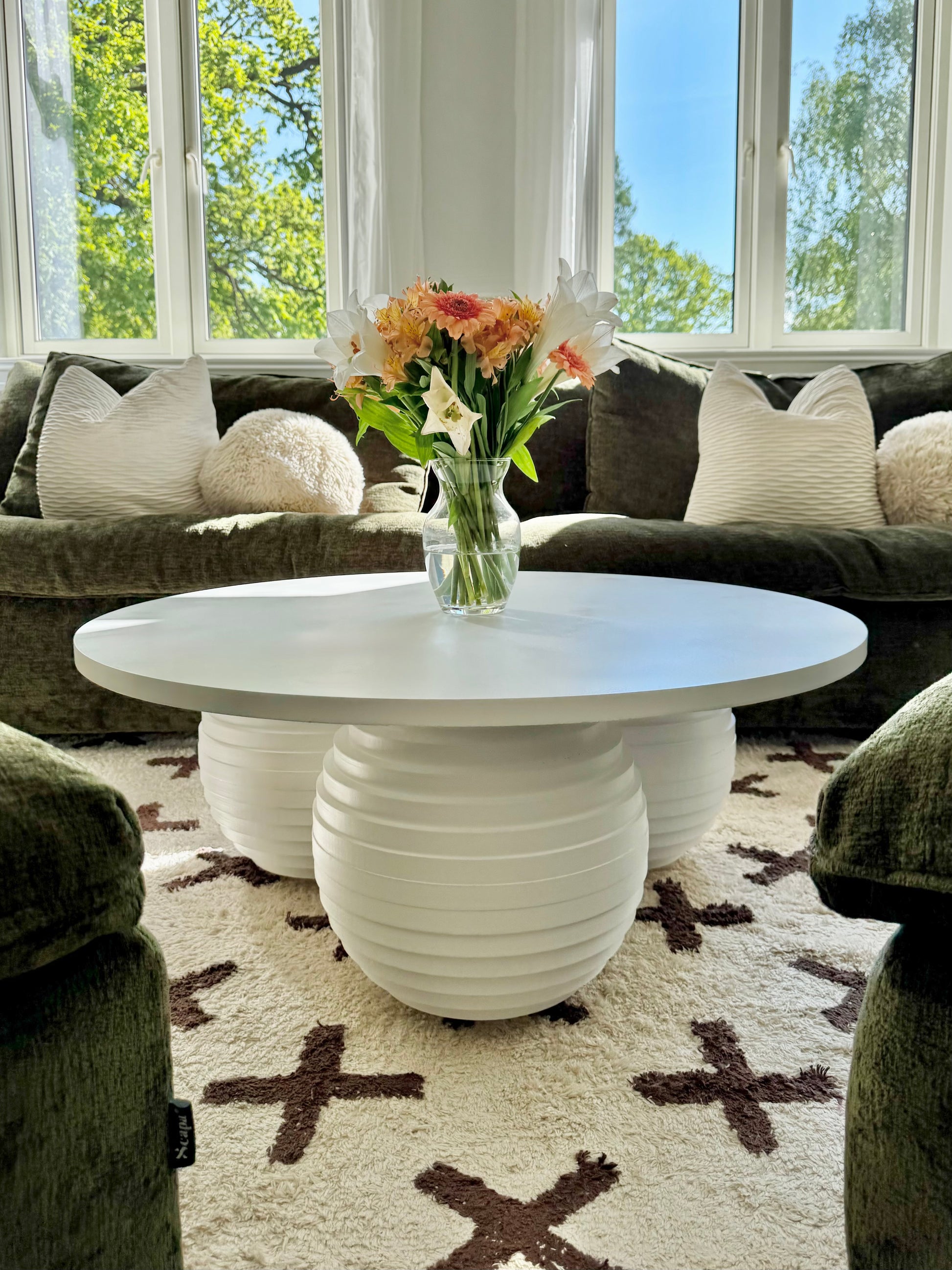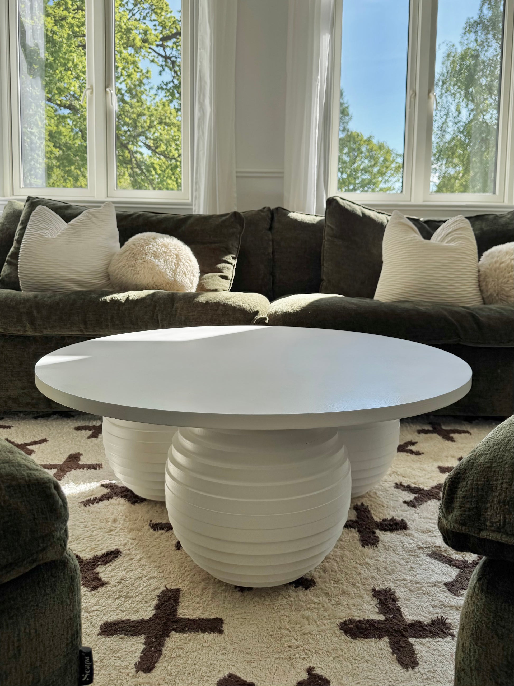 Dette sofabordet er designet og laget for hånd på et verksted på Grünerløkka. Bordet er laget av MDF, spraylakkert i en ren hvit farge, og toppplaten har fått et ekstra lag med epoxy for å sikre maksimal holdbarhet og motstand mot slitasje.
